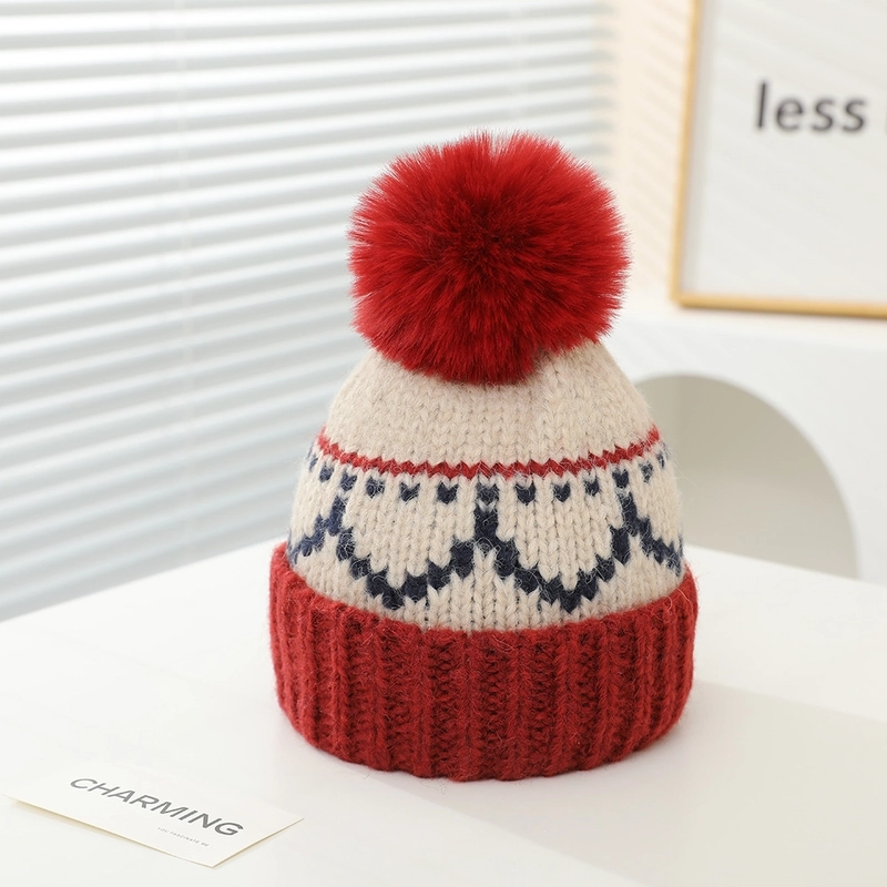 Retro Color Matching Rhombus Fur Ball Knitted Hat Winter Children Thickened Warm Wool Hat Medium And Large Children Travel Sleeve Cap