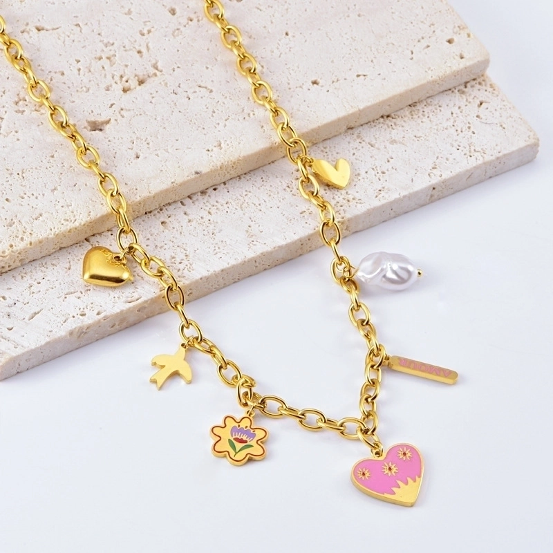 Sweet Minimalist Heart Shape Flower 304 Stainless Steel Titanium Steel Epoxy Pearl Plating Stainless Steel Necklaces